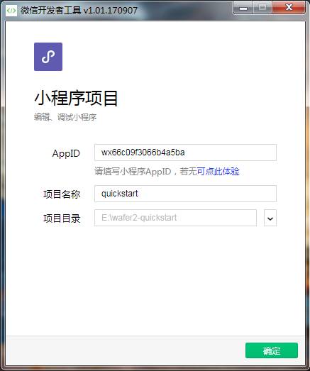 2.输入小程序?AppID,项目目录选择上一步下载下来的代码目录,点击确定创建小程序项目。